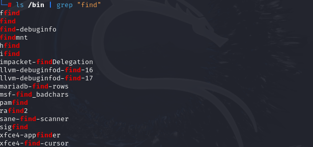 요렇게 /bin 내부의 파일들 중 "find"가 포함된 파일을 찾을 수도 있음.